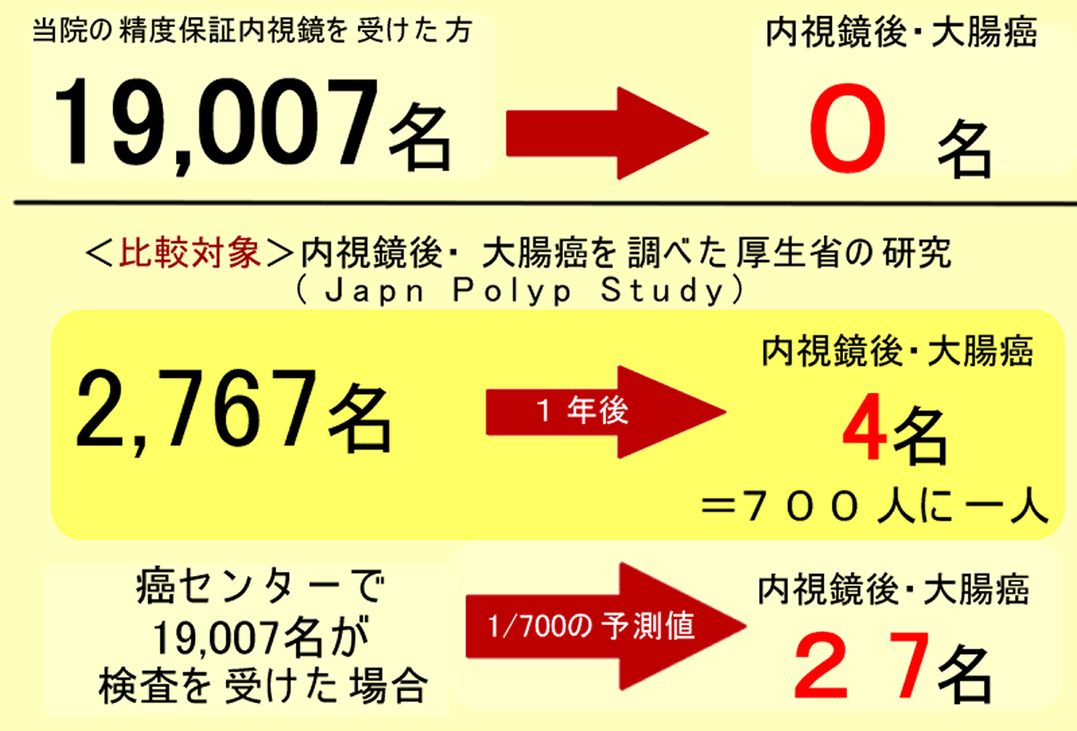 当院の精度保証は多くの方が3年間保証(Cランク)ですが、再検査の時期はバラバラで、1年後に再検査(ポリープ切除)を受ける方もいます。よって他報告との比較は「1年後PCCRC」で比較するのが合理的です。対象としてJPS(Japan Polyp Study)では1年後のPCCRCは1/700でしたので、27名の大腸癌が発生したと予測できます(他の国内外の1年後PCCRC報告)。JPSは癌センター等の日本のトップレベル病院の臨床試験ですから日本全体の実情はもっと悪いでしょう。 当院の精度保証検査の成績は最低でも「ゼロ対27」以上と言えます。