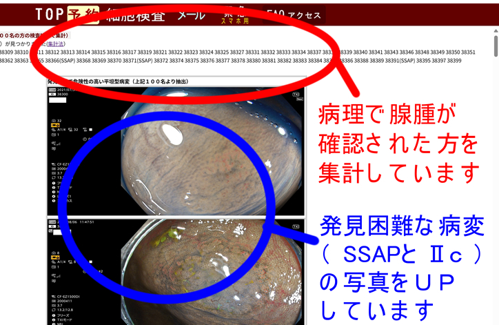 なお「発見困難で危険性の高い平坦型病変(上記100名より抽出) 」として表示している写真は、腺腫だけではなくて平坦なSSAPを多く含んでいます。こちらの方が「発見がより困難」だからですが、ADRの数字は、あくまでも病理報告書に「Adenoma」の記載があったもののみを集計しています。また病理報告書に「Sessile Serrated Adenoma」と明記された場合は「SSAPを含むADR」に集計しています。(SSLは含みません)。