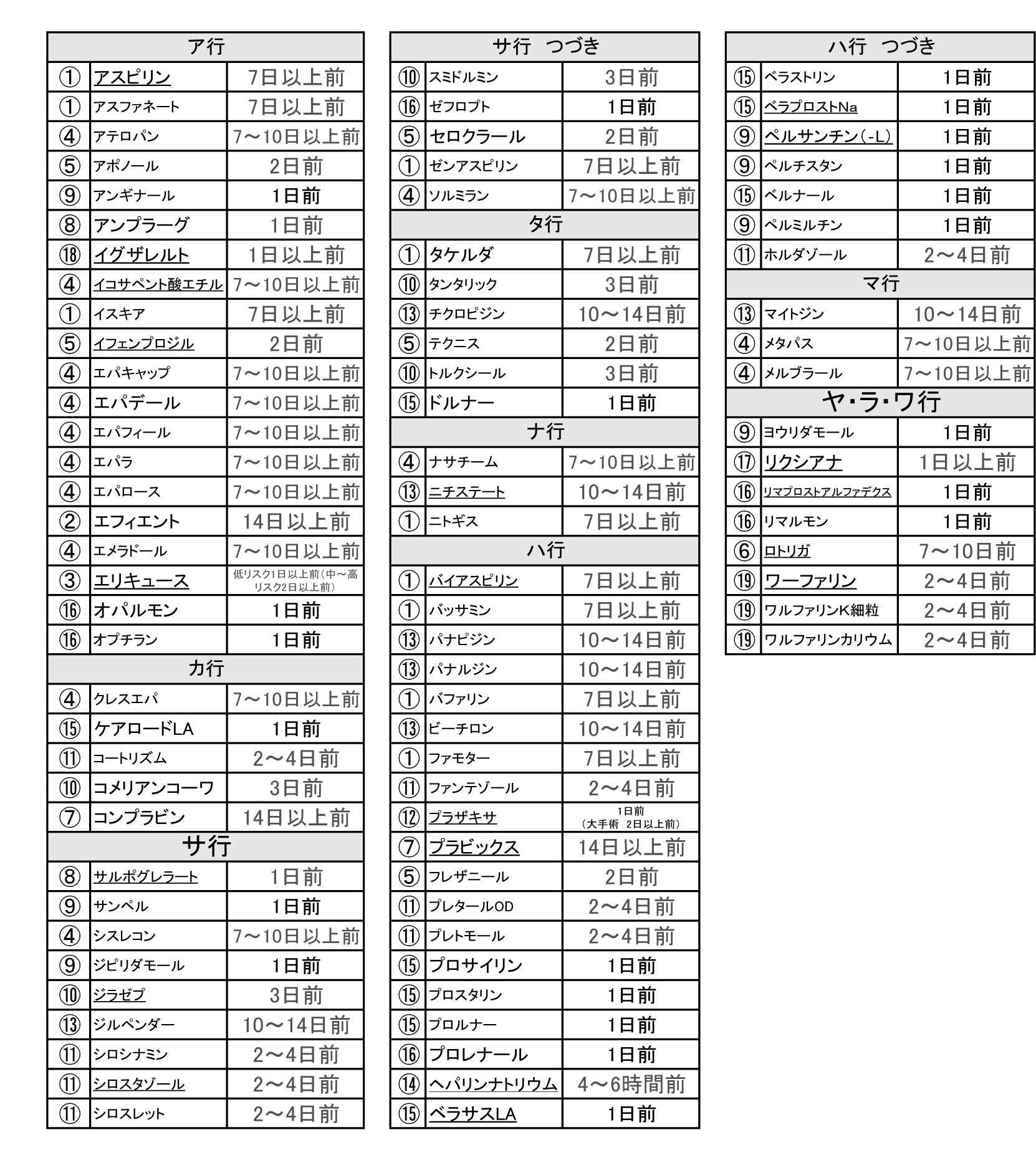 この表の休薬期間は大体の一般的な目安です。GOOGLEなどで「抗血栓薬の休薬期間」で検索していただきますと、より詳しい資料が入手できますが施設により若干の違いがあります。(この表は聖マリアンナ医科大学HPより転載させていただきました。)大腸癌検診最新情報