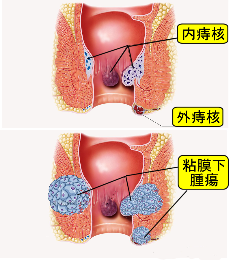 肛門周辺は粘膜下腫瘍が発生した場合に内痔核と区別が難しいです。また、外痔核がひどいと、初期の扁平上皮癌は解り難いです(下図)。