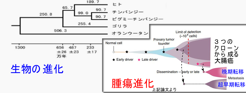 「腫瘍進化(下記捕捉)」の理論を使い、数学的な予測から、転移が見られた患者さんの81%は乳癌と同じく「超早期転移」であるという報告です。転移は1cm前後の良性のポリープの段階から起きます。冬眠した転移巣は一生、冬眠したままのことは無く、数年後に活発に暴れ出すか、細胞老化から死滅します。