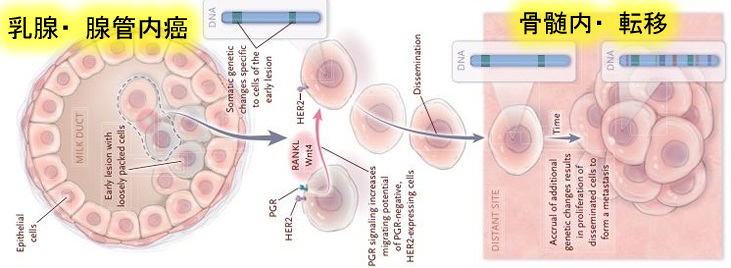「乳癌は乳腺の腺管内に限局している段階(画像診断は不可能な微小癌)から骨髄内に転移する。骨髄内に転移した病巣は何年も、冬眠状態を続け、何かの機会で活発になると全身に癌細胞をばら撒く」という仮説モデルです