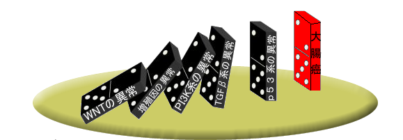 大腸癌は最低でも「5つのドミノ」が倒れなければ発生しません(下図)。正常な細胞が1回の細胞分裂で偶然の突然変異が起こる確率は(10の9乗)分の1です。「DNA校正装置」が正常なら、確率的に癌は発生しないはずであり「DNA校正装置の故障」こそが癌化の本質である、というのが現在、主流の理論です。