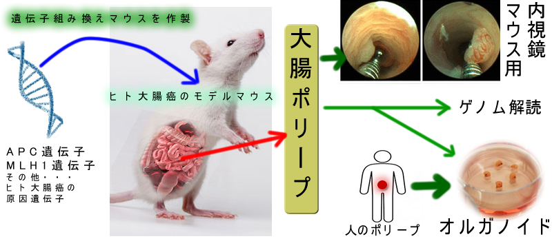 代わりに人の大腸癌の原因となる遺伝子を導入した「遺伝子組み換えマウス」で人の大腸癌発生を模倣するマウスを作り、ポリープがどのように癌化するかを調べるという手法が使われます。