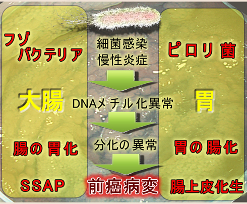 腸上皮化生の原因はピロリ菌感染による慢性持続的炎症です。こう考えると、「SSAP=慢性炎症原因説・フゾバクテリア菌原因説」も説得力が大きくなる訳です。腸上皮化生で胃の分化異常から胃癌へ進展する病態の研究は日本が世界をリードしています(東大病院HP)。その分子機序も解明が進んでおり、やはりCDX2が鍵であると考えられています。これらの「細胞分化研究」の応用がSSAPの病態解明の突破口になるかもしれません