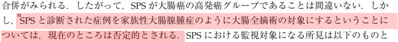 - 2017年 英国消化器病学会ガイドライン (1)他臓器癌が多いという報告も散見されるが、現時点ではSPSの方に胃カメラや他の癌検診が必須とは言えない(2)内視鏡的ポリープ切除で制御できないなら外科手術をすべきである