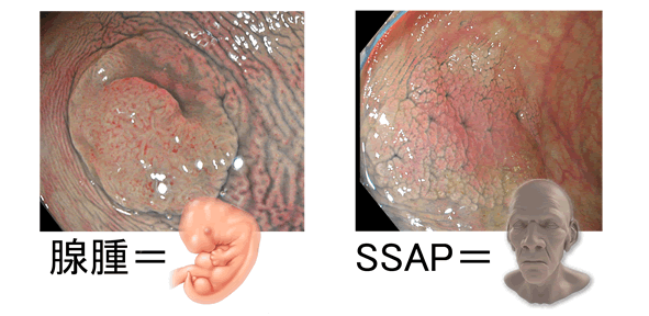 これから大腸のSSAPは他の臓器に発生する良性腫瘍と同じ性質の腫瘍。しかし大腸の腺腫は他の臓器には見られない稀有な性質の腫瘍である、と言えます。
