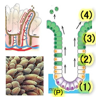 段階 アリに例えると マーカー (1)幹細胞 女王アリ LGR5 (P)Paneth細胞 女王の世話役 WNT (2)分裂増殖帯 子供の働きアリ KI67 (3)分化・成熟細胞 大人の働きアリ 腸特異的