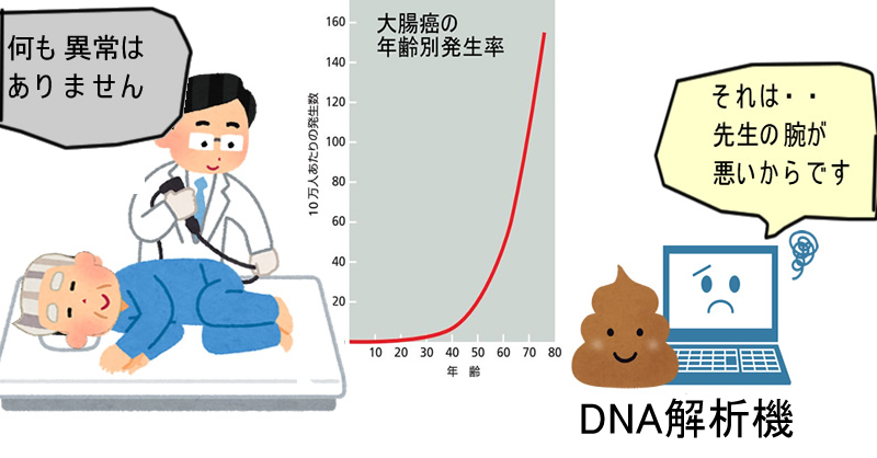 大腸癌は加齢により頻度が急激に増加します。しかし高齢になると大腸内視鏡の負担が非常に大きくなります。例えば下剤が原因で脱水となり脳梗塞などの重篤な事故も稀ではありません。「高齢者の大腸内視鏡を制限すべきである」というのが世界的な潮流であり、高齢者でも負担の無い「バイオマーカー検査」には大きな期待が寄せられています。