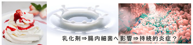 脂肪と水を混ぜる目的で天然の油脂などが使われます。簡単に言うなら「食べられる石鹸」です。「加工食品の乳化剤含有量が増加している」という報告が2019年にありました。乳化剤自体に発癌性があるとは考えられていません。しかし腸に乳化剤が到達すると腸細胞と腸内細菌の接触が変化します。これは細胞も細菌も細胞膜が脂肪でできているからで、その結果「軽度の慢性的な腸炎」が起きて大腸癌の原因になるという仮説が出されています。2015年にNatureで「乳化剤による腸の炎症」が報告され、2020年に「乳化剤の腸内細菌への影響」が報告され、2017年には「乳化剤による大腸癌の促進」が報告されました。