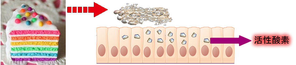酸化チタンが大腸癌を増加させる可能性が「マウスの大腸癌実験」で多数、指摘されています(2016年報告 2017年論文 2018年報告 2019年報告 2019年報告 2020年報告 )。酸化チタンは「ナノ粒子」で経口摂取すると腸の細胞に沈着することが解っており、これが活性酸素を産生し腸の炎症から発癌を誘発するという仮説が出されています。