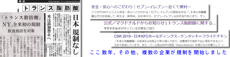 動脈硬化の重要な原因です。やはり加工食品に多く、数年前に欧米では大きな社会問題になりましたが、日本では摂取量が多くなかったため問題になりませんでした(農林水産省のHPが詳しいです)。複数の外資系のハンバーガー・フライドチキン、更に国内のチェーン店が「当社の製品はトランス脂肪酸を〜以下に抑えています」と強調しているのは、こういう事情からです。