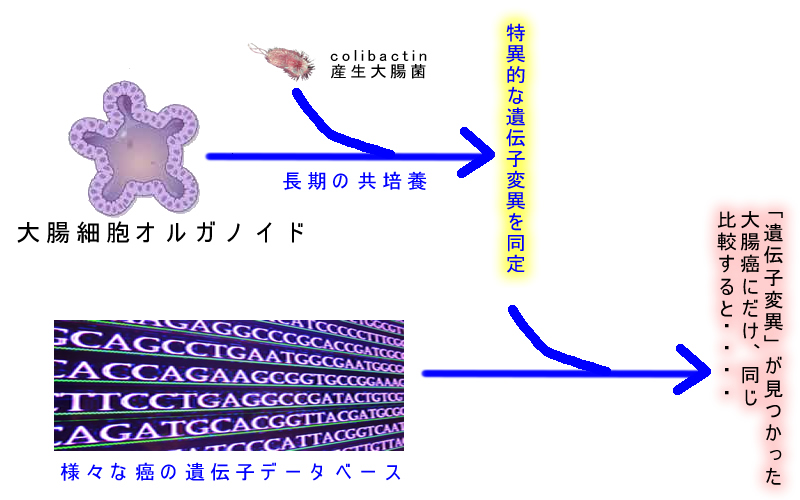 化学変化した胆汁、化学変化した動物性脂肪、化学変化したアルコール(アルデヒド)、炎症で発生する活性酸素、細菌の作る毒素・・・・・など、多くの「変異原性物質」が候補になりました。細菌の作る毒素はCDTやコリバクチンなど数種類の候補が見つかりました(参考)。しかし「決定的な証拠」がありませんでした。