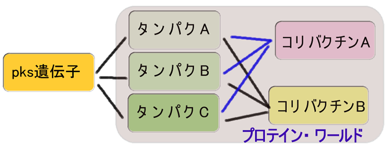 - コリバクチンを作る遺伝子(PKS)は多数の遺伝子が集団になった「かたまり」である。水平伝搬する遺伝子集団は病原性アイランド(島)と呼ばれます