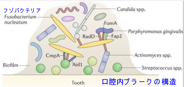 - 大腸癌組織を顕微鏡で調べるとフゾバクテリアが他の細菌と共同でバイオフィルムを作り口腔内プラークと似た状況が観察される。