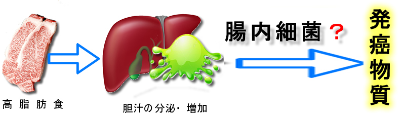 高脂肪食⇒胆汁⇒発癌物質という経路は「まず間違いない」とされています(Natuure文献 Cell文献)。そして胆汁の代謝(化学変化)に腸内細菌が重要な関与をしているという主張があります(2014年 Nature Revuew)