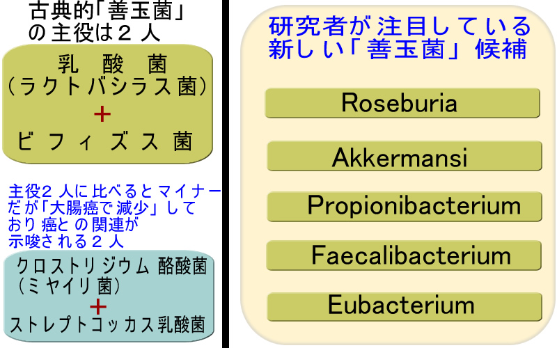 最も多くのヨーグルトに使われる、ラクトバシラス菌(乳酸菌)やビフィズス菌が大腸癌の方の腸内で減少しているという報告はありません。しかし一部のプロバイオティクスで使われているミヤイリ菌とストレプトコッカス乳酸菌は大腸癌で減少しており「大腸癌予防・善玉菌」である可能性があります。しかし、確実なデータはありません。また、他にも「5種の候補」がありますが・・・・研究は進んでいないようです。