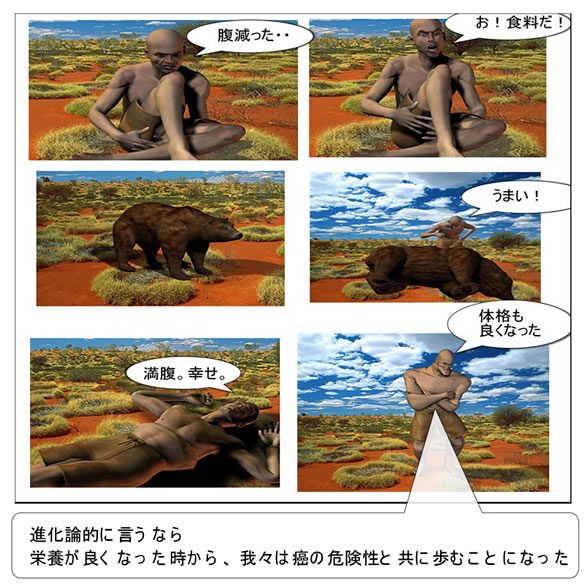 この「栄養過剰⇒癌」の現象は分子生物学的に言うと「IGFが高値になり、mTOR-Akt Kinase系が亢進」と表現されますが、簡単に言うと下の漫画になります。