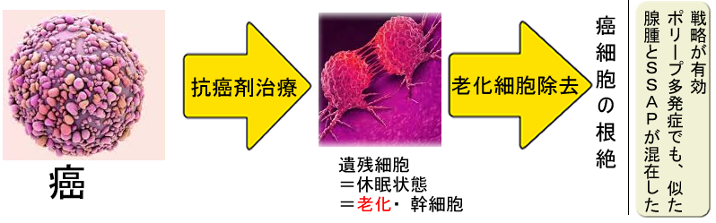 (専門的)「抗癌剤治療後の微少な癌の遺残」に「老化による休眠」が起きていると考えられており、下記のような「2重攻撃」が検討されています(2020年Review 2018年Review)。このような戦略は、将来「腺腫とSSAPが混在・多発する症例」を分子標的薬で根治するという場合にも重要になると思われます。