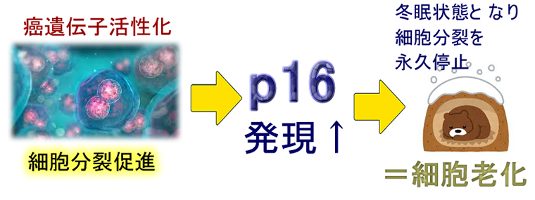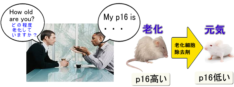細胞がどの程度、老化しているか?は年齢ではなくて個体のp16(他にp21,p53など)の発現量で決まります。血液のp16を測定することで、個人の老化具合が容易に判定できます。そして「どのような物がp16を増加させる(老化を促進)か、その逆か?」を調べることができます(2014年Reveiw)。タバコ、排気ガス中のベンゼン、紫外線、放射線 、などがp16を増加させる(老化を促進)ことが解りました。結局「発癌物質(=DNAを損傷)」=「老化促進物質」だった訳です。