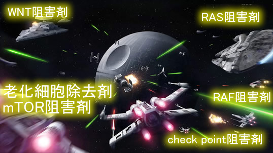 癌細胞と老化細胞は共通点が多く、細胞死(アポトーシス)誘導型の新しい抗癌剤は老化細胞除去剤にもなります。ダサニチブ(BCR阻害剤)とポリフェノール(クエルセチン)の併用(D+Q療法)が最もよく研究されており、糖尿病性腎症への治験、肺繊維症の治験、が進行中で、他にアルツファイマー、骨粗鬆症など多くの治験が計画されています(2020年Review)。抗癌剤よりも「老化細胞特異的な薬剤」の探求が続いて・・・冒頭の「日本発の3剤の開発」となった訳です。