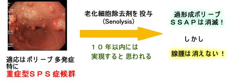 SSAPや過形成ポリープが多発する「重症型SPS症候群」では毎年、内視鏡を施行しても癌の発生を防げず、欧州では予防的大腸全摘手術が、しばしば選択されます(⇒2019年SPS,SSAPの最新情報)。理論的にSSAPは老化細胞除去剤で根治できるはずです。