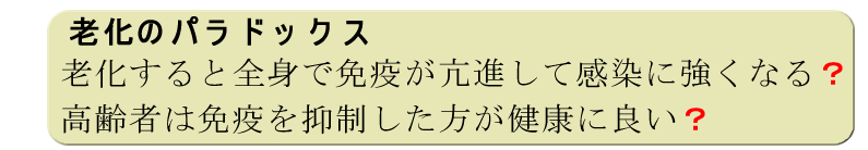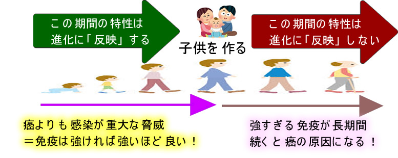 免疫不全になったAIDSの患者さんが癌が多いことから「免疫が癌の発生を予防している(免疫監視)」という仮説が出されました。しかしAIDSの患者さんが罹患するのは特殊な癌で大腸癌などの一般的な癌は多くありません。上記のSASPが免疫監視の正体の訳ですが、SASPこそが「実は発癌の原因」と考えられています。癌の患者さんの免疫強化は有益ですが、健康な人の「恒常的な免疫強化が有益か?」はイコールではない訳です。