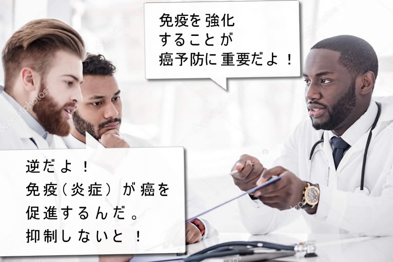 まず「特異的な免疫は癌を予防するが非特異的な免疫(炎症)は癌を促進する」という意見があります(文献)