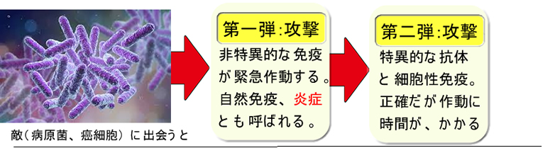 免疫システムは下図のように二段になっています。特異的免疫は癌の特異的抗原を狙う「ピンポイント爆撃」ですが、自然免疫(炎症反応)は、言わば「銃の無差別乱射」ですから、味方を撃つ危険があり、有害になる、という考えです。しかし第2弾攻撃には第一弾が必須で、両者を分離することはできません。また癌免疫の主役=NK細胞は第一弾です。