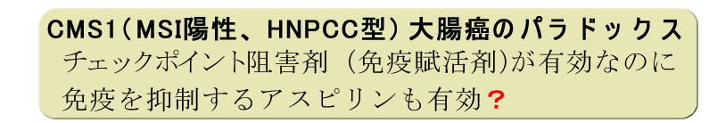 CMS1(=MSI陽性)大腸癌は抗原性が強く、免疫による排除が起き易く、免疫賦活剤(免疫チェックポイント阻害剤など)が著効します(詳しく)。アスピリンは炎症を抑え、免疫を弱める方向に働きますから「CMS1大腸癌」には、理論的に効果が無い可能性が考えられます。