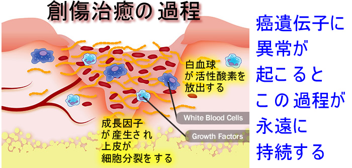 2017年文献より。癌遺伝子の異常が起きた細胞はSASP因子を分泌して炎症を誘起します(Tumor microenvironment ;TME)。これは創傷治癒と本質的に同じプロセスですが、腫瘍細胞は自己増殖しますから、正常な傷の治癒と異なり完結(傷の完治)することは無く炎症が恒久化する訳です。