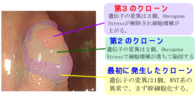 多くの場合、最初の異常は幹細胞化(WNT系の異常)です。これは大腸細胞の寿命は3日しかなく、遺伝子異常が蓄積されるためには、まず「細胞の寿命の延長」が不可欠だからです。
