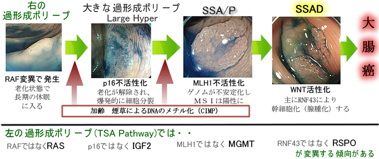 癌センターから詳細なゲノム解析が報告されています(2018年)。「RAFではなくRASが異常。またWNT系は、APCやRNF43でなくR-SPOが異常」と報告されています。「腺腫とSSAP,TSAは何が違うのか?」、この鍵は「WNT系の異常の違い」にあるのではないか?という仮説が2020年に報告されました(下記)。この考えからは「SUSAはTSAの亜型」と言えます