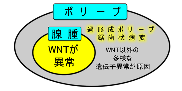 腺腫が癌化する過程と、過形成ポリープが癌化する過程は「最終的には」同じになります。WNTの異常が「最初に来るか?最後に来るか?」で違いが出ます