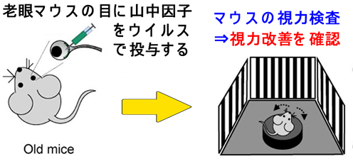 臨床応用に近いIn vivo Reprogrammingの決定版と言える報告がNature 2020年にありました。アストラゼネカのコロナワクチンと同じ方法(一過性発現型ウイルスベクター)で山中因子を導入し 、老化したマウスの視力を回復させることに成功しました(下図)。