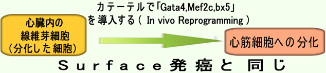 これらの現象は全て、遺伝子:DNAの変化を伴わず、「遺伝子の修飾(エピゲノム)」だけで起きます。具体的には「転写因子の正のフィードバック」と「クロマチンの変化」で「細胞の分化」が起きます。⇒発生学、幹細胞工学の基礎(The Cell 21〜22章の要約)このようにエピゲノムだけで細胞の分化状態を劇的に変える操作を「再プログラム(Reprogramming)」と呼びます。カテーテルなどを使い、成体内で直接、細胞の分化状態を変える操作を「In vivo Reprogramming 」と呼びます。