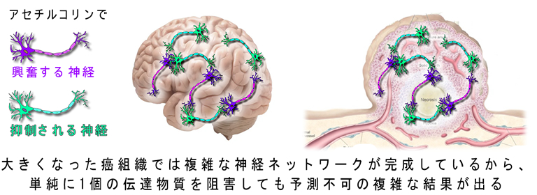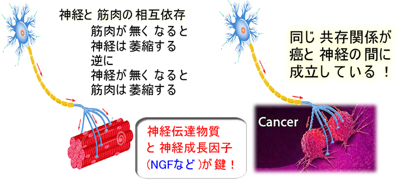 正常な神経を除去すると筋肉が萎縮します(下図)。これと同じで、神経を除去すると癌が萎縮します。