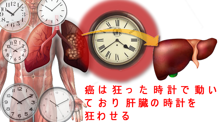 全身の器官が1日3回の食事時間に合わせて代謝を調整します。しかし癌だけは「唯我独尊」で時計を無視した独自の代謝(嫌気的リン酸化)を進めます。Warburg効果と呼ばれ、PETで癌が検出できる理由です。癌は時計を無視した「自分に優位な環境(Tumor Macroenvironment)」を全身に広げていきます。これが悪液質の正体であろうという仮説モデルです。