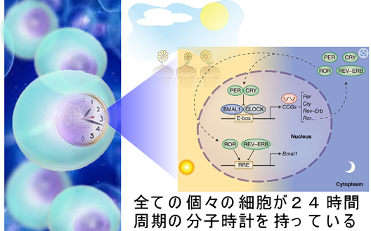 脳内時計はメラトニンで調整され睡眠リズムを司ります。これとは全く別の「1個の細胞レベルの分子時計」が全身の全ての細胞内にあります(下図)。これを利用している例として、細胞はDNA損傷の起きにくい夜間(=太陽光線が少ない)に細胞分裂を行います。この性質のため癌の転移は夜間に起こるという驚くべき事実があります(2022年Nature)。
