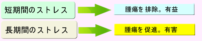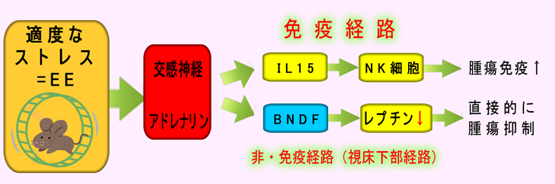 快ストレスの癌抑制効果が2015年のNatureに報告されました。BDNFの増加とレプチンの減少が関与していると2010年Cellに報告されました。免疫強化はNK細胞↑が経路です。