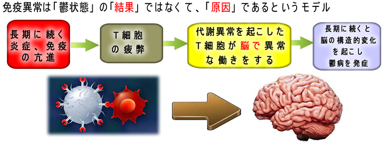 上記のモデルは「ストレス⇒免疫異常⇒腸の炎症」の構図ですが2019年のCellの報告は「免疫異常⇒脳⇒鬱状態」という逆方向のモデルを提案しています(下図)。