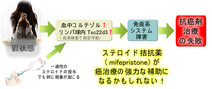 2019年のNatureに注目すべき報告がありました。癌の患者さんの精神状態はPTSDと似ており、慢性的ストレスのために内因性のコルチゾルが高値になります。これが免疫抑制を起こし「治療の失敗」の原因になるという内容です。