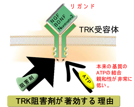 「癌と神経伝達物質」の研究では最も成功した例と言えます。TRK阻害剤が著効する理由は競合する相手(ATP)が「非常に弱いから」という説が有力です(下図)が、「本来、脳で発現すべき受容体が異所性に癌で発現し、これを抑えたら癌が死ぬ」という現象には「信じられない偶然」としか言えません。