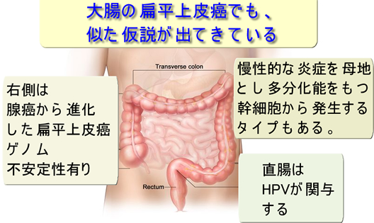 興味深いことに、「大腸の扁平上皮癌(上行結腸と直腸に多い)」でも似たような仮説モデルが提唱されています