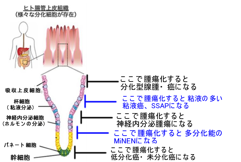 神経内分泌腫瘍は以前はNeural Crestという「神経細胞」由来と考えられていましたが、現在は、腸管の陰窩由来の「多分化能を持った幹細胞」が腫瘍化する、という考えが主流です。腸の陰窩の発生・分化は血液細胞と同様に「段階的なコミットメント(運命付け)」が起きていると予想されます。造血系では最初に多能性の幹細胞が有り、これが「骨髄系」「リンパ系」に分かれて最終的に好中球やT細胞に分化します。腸も同じで多能性の幹細胞から始まり、パネート細胞、内分泌細胞、杯細胞、吸収上皮細胞と「段階的なコミットメント(運命付け)」が起きて分化していきます(単一祖先理論=Unitary Intestinal Stem Cell Theory)。