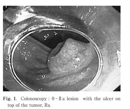 潰瘍化した0-Uaと記載されていますが、境界が滑らかであり、実は粘膜下腫瘍です。