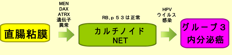 HPVウイルス 発生場所 内分泌癌(NEC) グループ1 陰性 右側 グループ2 陰性 左側 グループ3 陽性 直腸 NET(カルチノイド) 陰性 直腸