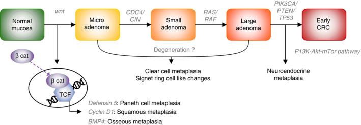 進行した大腸癌では、内分泌化生(NeuroEndocrine Cell-Differentiation)は、ありふれた現象であるが、良性ポリープでも3.8%に見られる。この場合はMANETと呼ばれる。MANETは「高度異型腺腫」に、よく起こる傾向があるが、ポリープのサイズや発生場所には傾向は無い。βカテニン蓄積が見られれ、FAPに多いことから「WNTシステム異常の一つの曲面」と考えられる(文献)。p53、KRAS,BRAF,PIK3Cの異常は通常の腺腫と比較しても差は無い。またMSIも無い。これは「グループ1型の内分泌癌が激しい遺伝子異常がある(=大腸癌の遺伝子異常+RBシステム異常+MSIが多い)」とは対照的である。結論としてMANET現象はWNTシステム異常だけで起こる現象であり、臨床的な意義は「高度異型腺腫」と同じであり予後は極めて良好である。MANETをMiNENと同一視すべきではない。