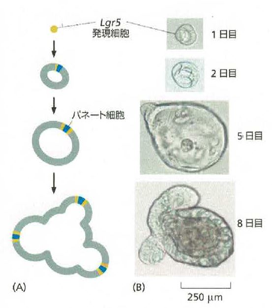 1個の腸の幹細胞(Lgr5細胞)を培養していきます。すると、幹細胞は最初にパネート細胞を作ります。そして、そのパネート細胞の隣が幹細胞になります。ずっと、幹細胞のまま分裂増殖すれば、「未分化癌」なので、これは自然な現象と言えます。「親が子供を作り、その子供が又、親を作る」という関係です。培養された細胞は、陰窩と同じ構造(オルガノイド)を作ります.