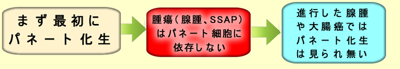 腸の細胞の寿命は3日しかないので、本来、遺伝子変異の蓄積には「まず幹細胞化(細胞寿命の延長)」が腫瘍発生には必須なはずであり、それにはパネート細胞が最初に重要な役割をしているはずです。一方、腺腫とは「WNTシステムの異常によりパネート細胞に依存せずに幹細胞化した状態」と言えます。また、SSAPとは「老化して冬眠状態にはいっており幹細胞化していない」と言えます(⇒ポリープは老化するか?)。この理論からは「腺腫もSSAPもパネート化生に依存しない」と言えます。
